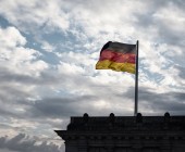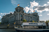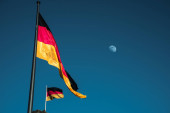 Berlin Niemcy, niemieckie flagi w Reichstagu z widokiem na księżyc