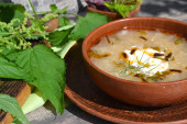Zupa z pokrzywy na ceramicznej misce na stole rustykalnym. Rosyjskie zielone shchi z pokrzywą
