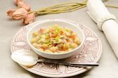 Duszona fasola żurawinowa lub fasolę w sosie pomidorowym z ziołami w misce. poziomy widok z góry na Zdjęcie stockowe