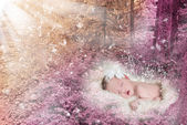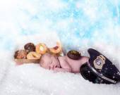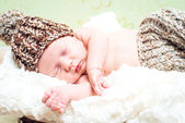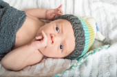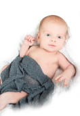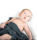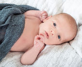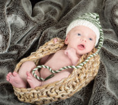 Urocza niebieskooki noworodka w drutach kosz z zielonej i whi