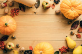 Jesienny widok żywności, Święto Dziękczynienia lub tło Halloween: dynie, orzechy, spadające liście i przyprawy na brązowym drewnianym tle. Sezonowe tło jesiennego obiadu lub festiwalu żniw. Przestrzeń kopiowania