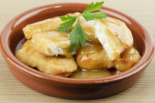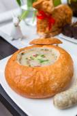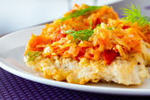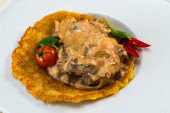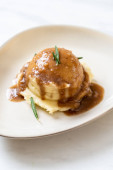 Smaczny obiad na talerzu ziemniaków z sosem i kurczakiem
