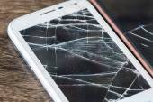 Na drewnianej ławce leży smartfon z zepsutym ekranem wyświetlacza. Skupienie selektywne