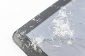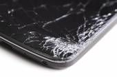 Na drewnianej ławce leży smartfon z zepsutym ekranem wyświetlacza. Zbliżenie, selektywne ukierunkowanie