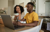 Zdjęcie "Uśmiechnięta młoda para Afroamerykanów korzystająca z tabletu cyfrowego podczas śniadania przy stole rano" może być wykorzystywane do celów osobistych i komercyjnych zgodnie z warunkami zakupionej licencji Royalty-free. Obraz jest dostępny do pobrania w jakości wysokiej rozdzielczości do 5760x3840.