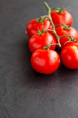 Świeże pomidory wiśniowe na czarnym tle. Widok boczny z przestrzenią do kopiowania.