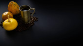 Pomarańcze i limonka w wysokim szklanym tle w ciepłych ciemnych odcieniach zamazane. Ciepły ton. Orientacja pozioma.