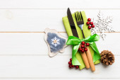 Widok z góry widelec i nóż związany wstążką na serwetce na drewnianym tle. Dekoracje świąteczne i choinka noworoczna. Szczęśliwy pomysł na wakacje z pustą przestrzenią do projektowania