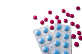 Zdjęcie "Czerwone i niebieskie tabletki na białym tle. Rozproszone czerwone tabletki z plastikowego słoika obok niebieskich tabletek w blistrach" może być wykorzystywane do celów osobistych i komercyjnych zgodnie z warunkami zakupionej licencji Royalty-free. Obraz jest dostępny do pobrania w jakości wysokiej rozdzielczości do 5760x3840.