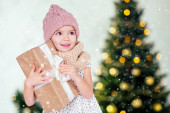 dziewczynka w dzianinie kapelusz trzymając fajerwerki na ciemnoniebieskim tle.Cute blond dziecko z xmas dream.Happy dziecko cieszyć się iskry ognia. Święty Mikołaj lecący w saniach w przeddzień Bożego Narodzenia śnieżne niebo