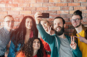 Zdjęcie "W domu Różnorodna grupa przyjaciół robi zbiorowe Selfie, Guy trzyma Smartphone People Uśmiech, Śmiech i Duck Lips.Young ludzi robi strumień na żywo z Home Party." może być wykorzystywane do celów osobistych i komercyjnych zgodnie z warunkami zakupionej licencji Royalty-free. Obraz jest dostępny do pobrania w jakości wysokiej rozdzielczości do 5760x3840.