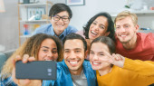 W domu Różnorodna grupa przyjaciół robi zbiorowe Selfie, Guy trzyma Smartphone People Uśmiech, Śmiech i Duck Lips.Young ludzi robi strumień na żywo z Home Party.
