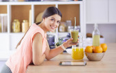Zdjęcie "Piękna sportowa młoda kobieta pije sok detox słuchając muzyki ze smartfonem w kuchni." może być wykorzystywane do celów osobistych i komercyjnych zgodnie z warunkami zakupionej licencji Royalty-free. Obraz jest dostępny do pobrania w jakości wysokiej rozdzielczości do 5760x3840.