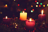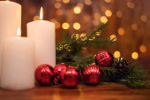Gałązki drzew, szyszki, lampki bokeh, świece, świąteczne kulki. Przygotowanie do Nowego Roku