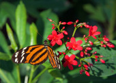 Motyl czarny jaskółczy, zwany również amerykańskim jaskółczym ogonem lub pasternakiem. Picie nektaru z pomarańczowych i żółtych kwiatów Lantana, widok z boku