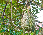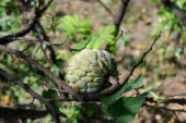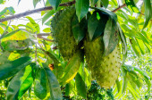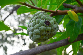Dojrzały zielony sweetsop, z jasnożółtymi rowkami między przylegającymi kołkami, zawieszony jest na drzewie długą łodygą..