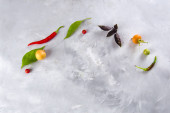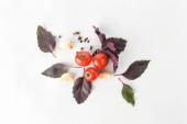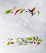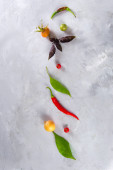 Warzywa i warzywa. Pomidory, papryka, bazylia, przyprawy, jagody na szarym tle