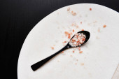 Zupa pomidorowa ze śmietaną w czarnej misce na szarym kamiennym tle.