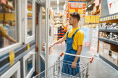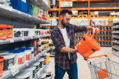 Mężczyzna konsument wybierający materiały naprawcze w sklepie z narzędziami. Klienci patrzą na towary w sklepie diy