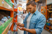 Zdjęcie "Mężczyzna konsument wybierający materiały naprawcze w sklepie z narzędziami. Klienci patrzą na towary w sklepie diy" może być wykorzystywane do celów osobistych i komercyjnych zgodnie z warunkami zakupionej licencji Royalty-free. Obraz jest dostępny do pobrania w jakości wysokiej rozdzielczości do 5760x3840.