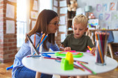 Zdjęcie "Młode, kaukaskie dziecko bawiące się w przedszkolu z nauczycielem. Matka i syn w pokoju zabaw rysunek z ołówkami kolor" może być wykorzystywane do celów osobistych i komercyjnych zgodnie z warunkami zakupionej licencji Royalty-free. Obraz jest dostępny do pobrania w jakości wysokiej rozdzielczości do 5760x3840.