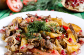 pieczona cielęcina z pomidorami ozdobiona zielenią i owocami granatu drewniane tło