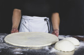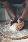Szef kuchni w kuchni przygotowuje ciasto z mąki do pizzy