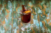 selektywne ukierunkowanie sezonowego tradycyjnego gruszkowego grzanego wina z przyprawami w szklance na drewnianym rustykalnym stole