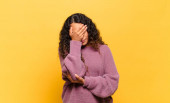 Zdjęcie "młoda ładna czarna kobieta zakrywając twarz ręką i kładąc drugą rękę z przodu, aby zatrzymać aparat, odmawiając zdjęć lub zdjęć na pomarańczowej ścianie" może być wykorzystywane do celów osobistych i komercyjnych zgodnie z warunkami zakupionej licencji Royalty-free. Obraz jest dostępny do pobrania w jakości wysokiej rozdzielczości do 5760x3840.