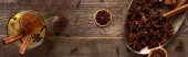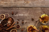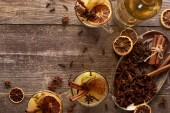 widok z góry białe wino i przyprawy na drewnianym rustykalnym stole