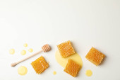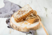 Płyta z dyszy i plastrów miodu na drewnianym tle, miejsce na