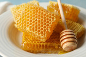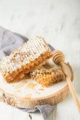 Płyta z dyszy i plastrów miodu na drewnianym tle, miejsce na