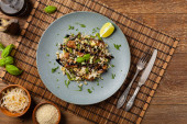 Zdjęcie "widok z góry pyszne pikantne tajskie makaron w pobliżu pałeczek, kukurydza. papryka i pietruszka na marmurowej szarej powierzchni" może być wykorzystywane do celów osobistych i komercyjnych zgodnie z warunkami zakupionej licencji Royalty-free. Obraz jest dostępny do pobrania w jakości wysokiej rozdzielczości do 5760x3840.