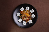 widok z góry smaczne pikantne mięso tajskie makaron w pobliżu pałeczek na drewnianej szarej powierzchni