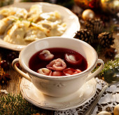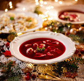 Christmas beetroot soup, borscht with small dumplings with mushroom filling in a ceramic white plate on a holiday table.Traditional Christmas eve dish in Poland.