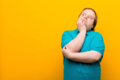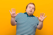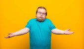 Zdjęcie "młody duży człowiek czuje się bardzo zszokowany i zaskoczony, niespokojny i panikujący, ze stresowanym i przerażającym spojrzeniem na pomarańczową ścianę" może być wykorzystywane do celów osobistych i komercyjnych zgodnie z warunkami zakupionej licencji Royalty-free. Obraz jest dostępny do pobrania w jakości wysokiej rozdzielczości do 5760x3840.
