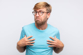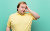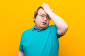 młody duży człowiek czuje się bardzo zszokowany i zaskoczony, niespokojny i panikujący, ze stresowanym i przerażającym spojrzeniem na pomarańczową ścianę