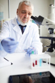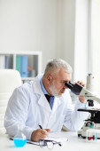 zbliżenie Dojrzały lekarz w białym fartuchu siedzi przy stole pisząc w schowku podczas badań medycznych w laboratorium