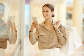 Zdjęcie "Uśmiechnięta młoda kobieta trzymająca papierowe torby i korzystająca z telefonu komórkowego podczas spaceru po centrum handlowym" może być wykorzystywane do celów osobistych i komercyjnych zgodnie z warunkami zakupionej licencji Royalty-free. Obraz jest dostępny do pobrania w jakości wysokiej rozdzielczości do 5760x3840.