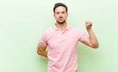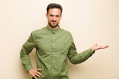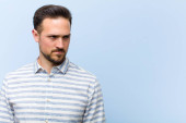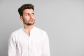 młody przystojny mężczyzna wątpiący lub myślący, gryzący wargi i czujący się niepewnie i nerwowo, chcący skopiować przestrzeń na boku