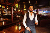 Przystojny, dobrze ubrany arabczyk ze szklanką whisky i cygą.