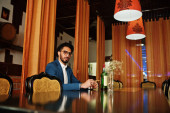 Przystojny, dobrze ubrany arabczyk ze szklanką whisky i cygą.
