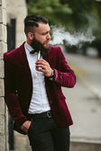 Przystojny dobrze ubrany arabczyk pali cygaro na balkonie pubu.