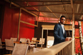 Przystojny dobrze ubrany arabczyk pali cygaro na balkonie pubu.