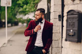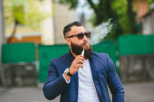 Przystojny dobrze ubrany arabczyk pali cygaro na balkonie pubu.