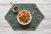 Pyszna włoska zupa z kiełbasą z owocami w filiżance