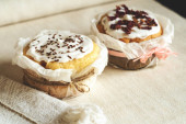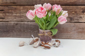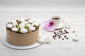 Bukiet białych tulipanów, kawa i ciasto czekoladowe