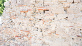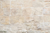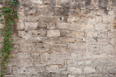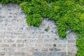 Fragment tradycyjnego ogrodzenia z kamiennych bloków. Na szczycie ogrodzenia rośnie roślina wspinaczkowa. Besancon. Francja.