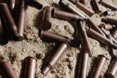 Kupa zakrwawionych pocisków karabinowych leżących na polu bitwy.