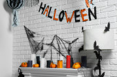 Zdjęcie "Nowoczesny pokój urządzony na Halloween. Pomysł na świąteczne wnętrze" może być wykorzystywane do celów osobistych i komercyjnych zgodnie z warunkami zakupionej licencji Royalty-free. Obraz jest dostępny do pobrania w jakości wysokiej rozdzielczości do 5760x3840.